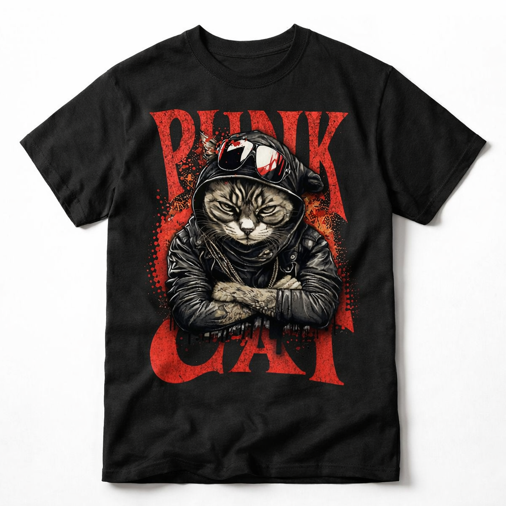 Maak een statement met dit opvallende Punk Cat T-shirt. De gedetailleerde illustratie van een rebelse kat in hoodie en leren jas straalt pure attitude uit. Geïnspireerd door punk- en rockcultuur is dit shirt perfect voor liefhebbers van streetwear, alternatieve mode en unieke dierenprints.