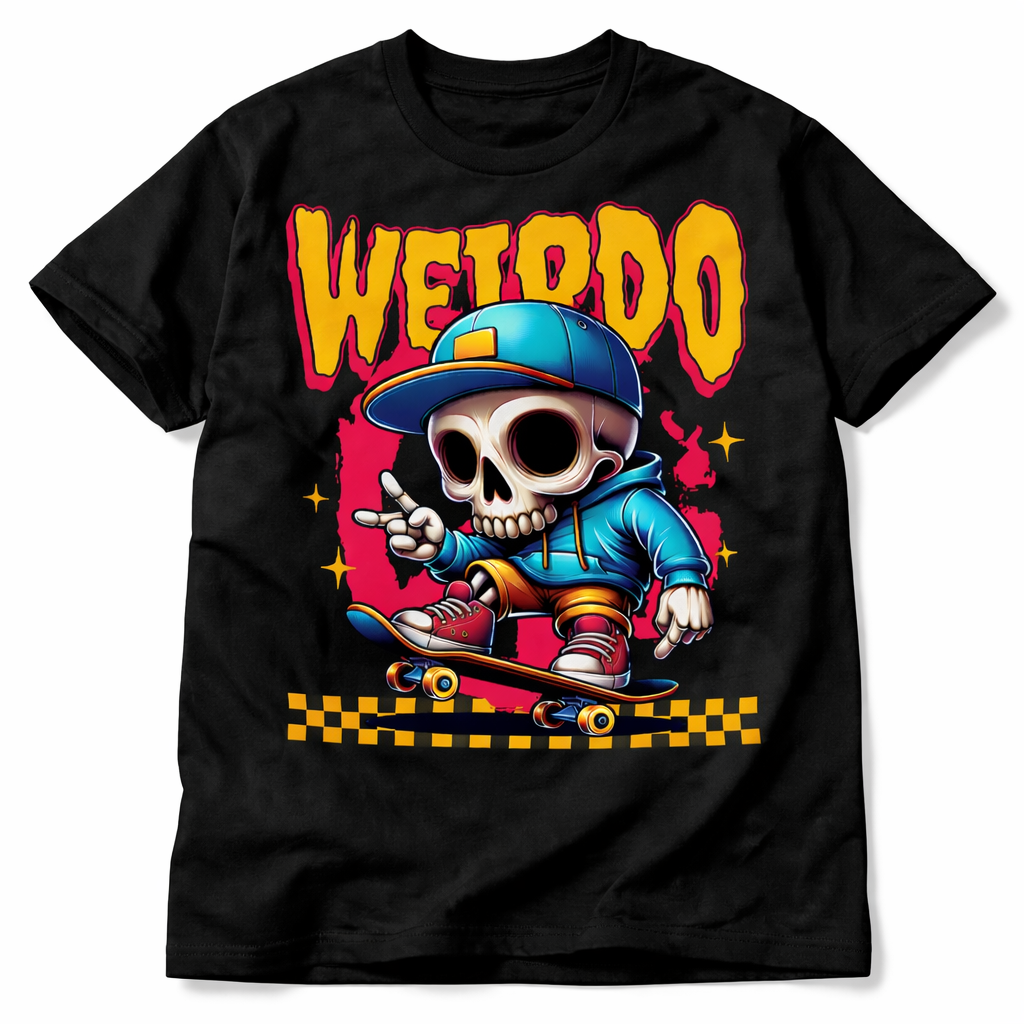 Laat je eigenzinnige stijl spreken met dit opvallende Weirdo Skater Skull T-shirt. Het design toont een speelse schedel op een skateboard, gekleed in urban streetwear en vol attitude. De felle kleuren springen eruit op de zwarte achtergrond en geven het shirt een stoere, moderne look.